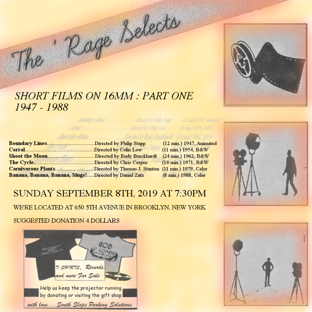 From 2018 to 2020, I helped research, organize and program film screenings for South Slope Parking Solutions, a former microcinema and event space in Park Slope, Brooklyn. Housed in a retrofitted garage, it was often known more colloquially as The ‘Rage. Exhibiting 16mm prints, VHS, and digital media, with a focus on under-seen and primarily NYC based repertory film, the venue was attended by those in-the-know and neighborhood passers-by, encouraging local viewers to experience and reflect upon art made by and about their community.